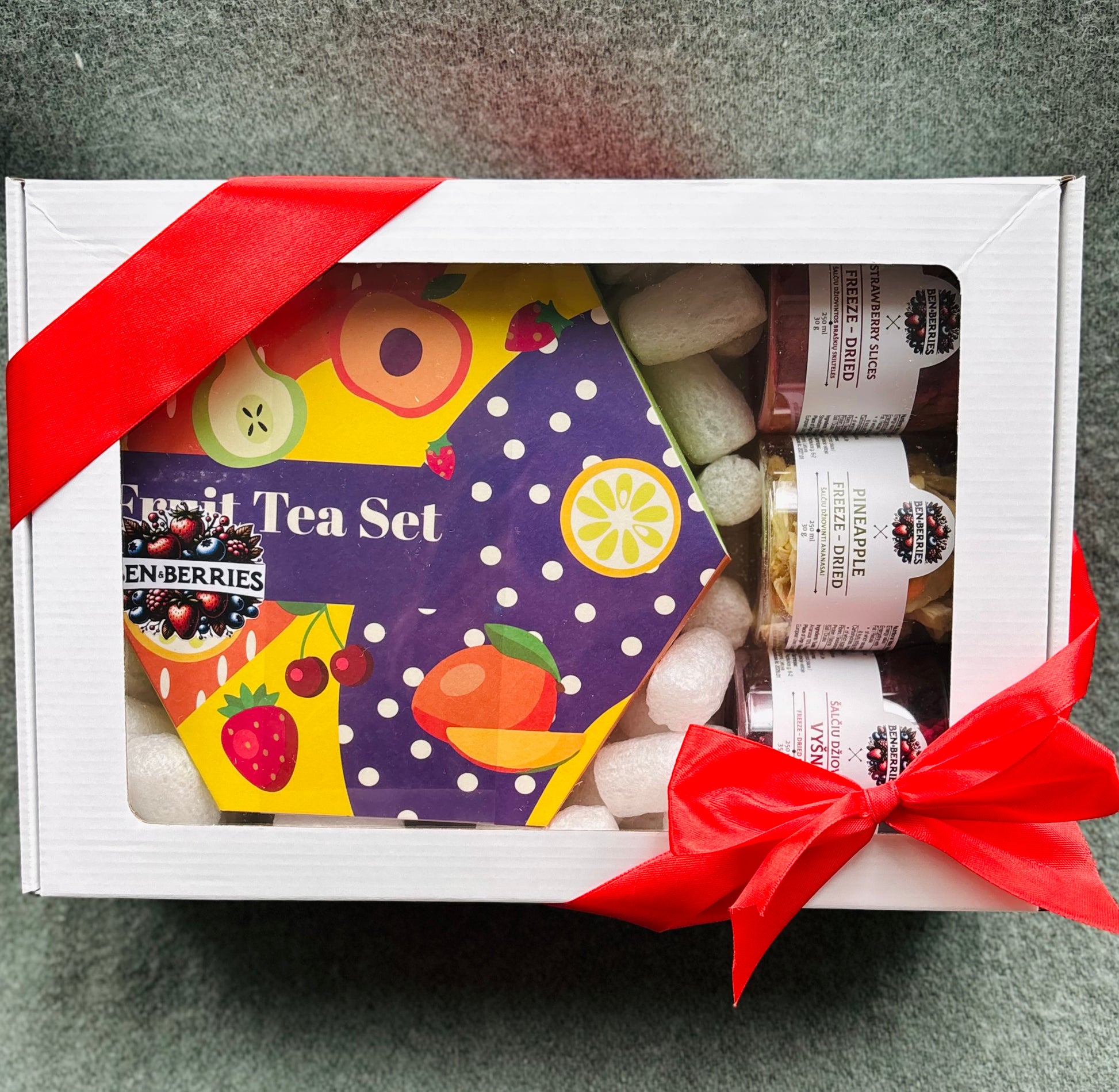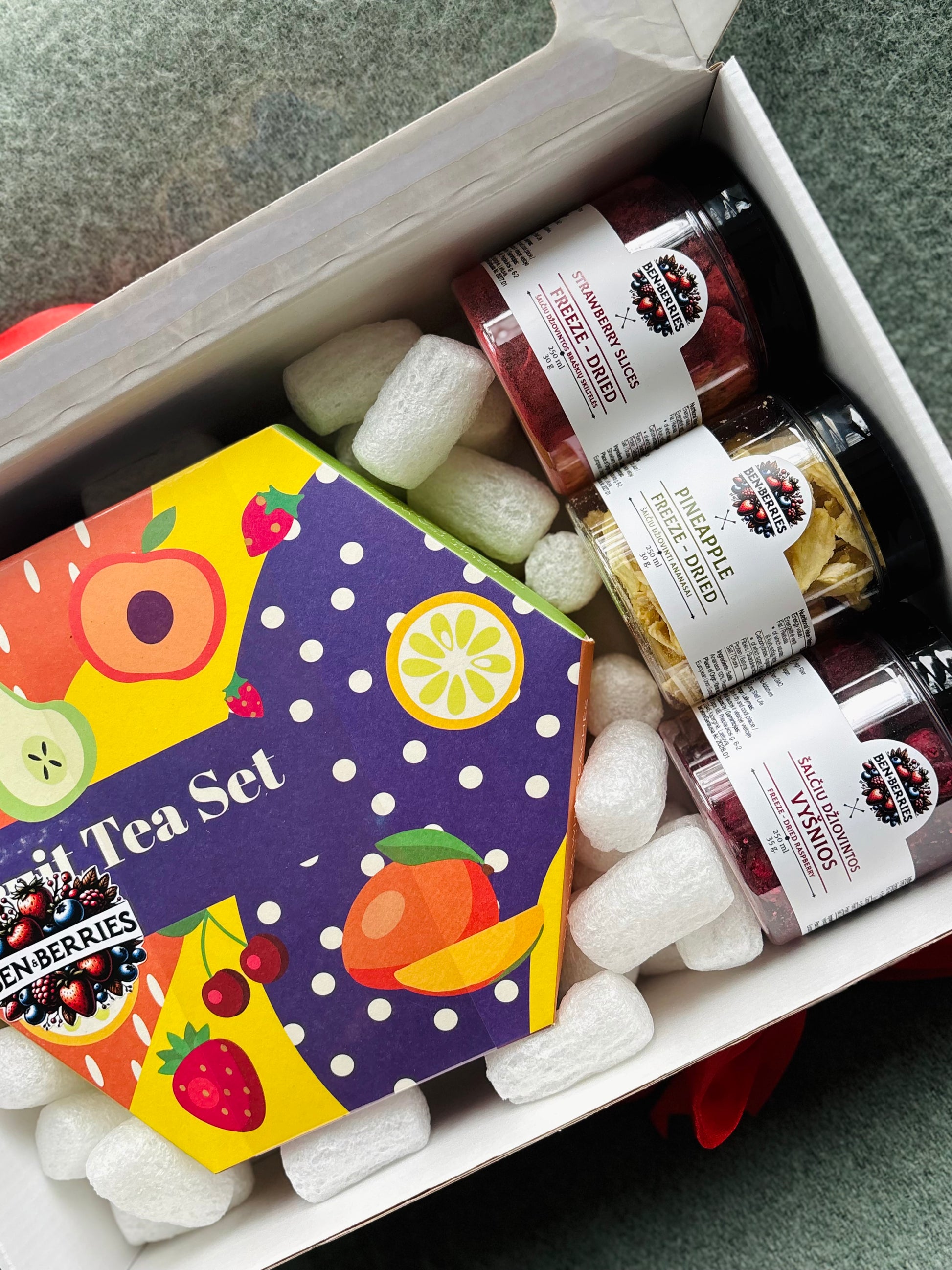 Čia susitinka elegantiškas prabangus vaisinės arbatos rinkinys ir mūsų ryškiausi, šaltyje džiovinti vaisiai.